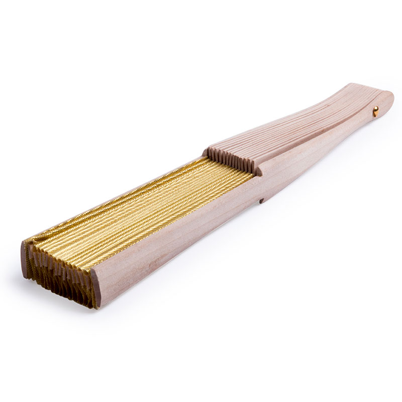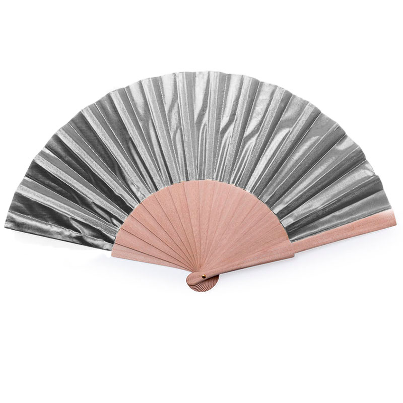Abanico de varillas de madera natural y tela en poliéster de acabado brillo. Disponible en colores dorado y plateado. Imprimimos tu imagen o logo a todo color.