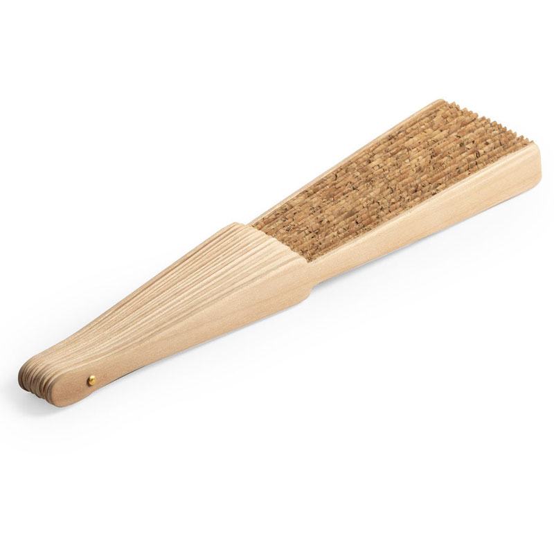 Abanico con varillas de madera y tela en corcho natural. Imprimimios tu imagen o logo a todo color.