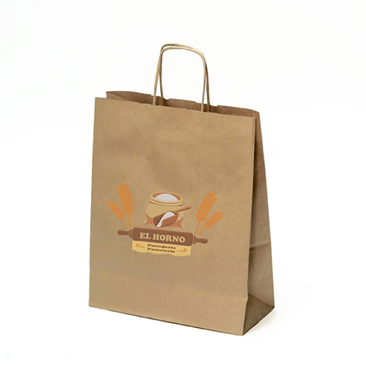 Papel kraft (natural) de 100 grs., con asas reforzadas y fuelle. Resistencia aproximada hasta 7 kgs.