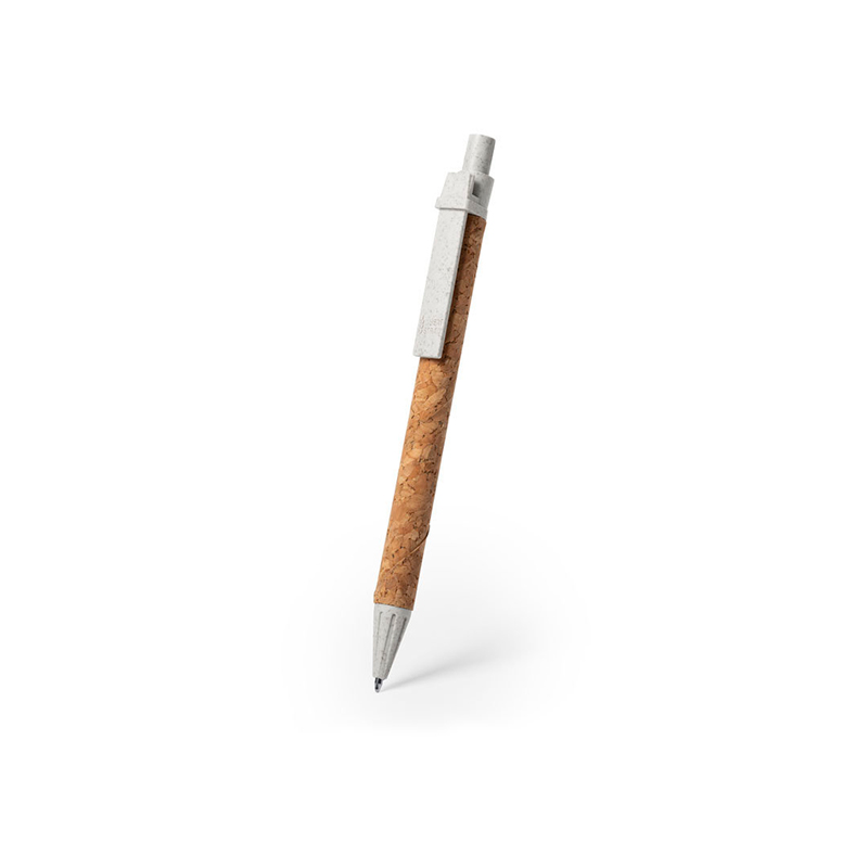 Bolígrafos fabricados en corcho natural y caña de trigo, con mecanismo pulsador y tinta azul. Personalízalos con tu logo, sin pedido mínimo. Opcionalmente se puede añadir una cajita de cartón personalizada a todo color.