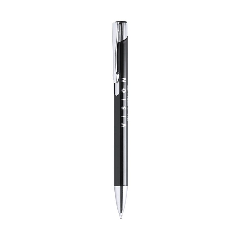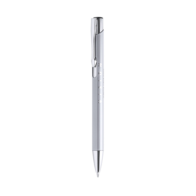 Bolígrafos de aluminio con cuerpo troquelado y mecanismo pulsador. Disponibles en varios colores: azul, rojo, verde, amarillo, negro y plateado. Opcionalmente se puede añadir una cajita de cartón personalizada a todo color.