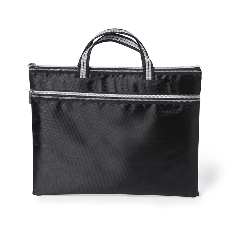 Estos portadocumentos fabricados en poliéster 300D incluyen un bolsillo frontal y asas de transporte a juego con el cierre de cremallera. Imprimimos tu imagen a una tinta.