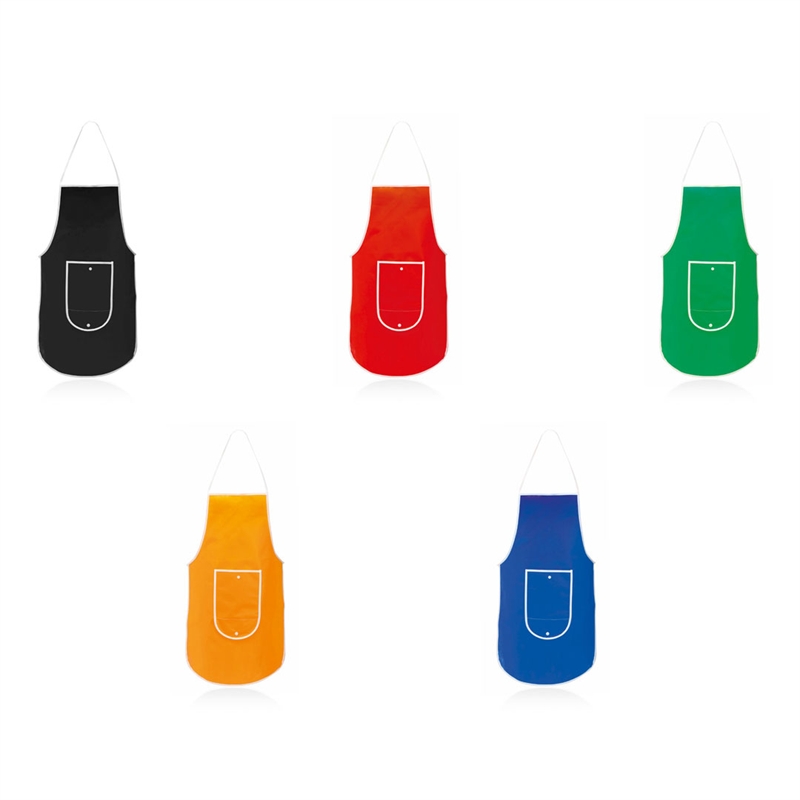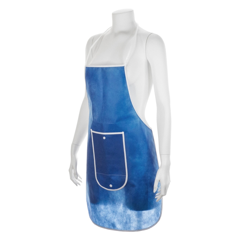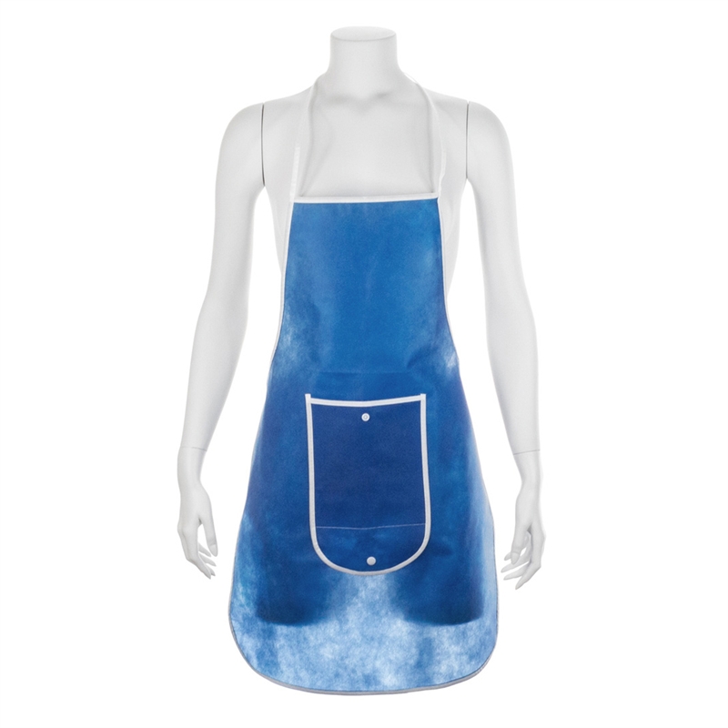 Estos delantales plegables están fabricados en material non-woven. Incluye bolsillo frontal, cintas de ajuste y ribetes en color blanco. Corte por encima de la rodilla. Personalizados con impresión a una tinta.