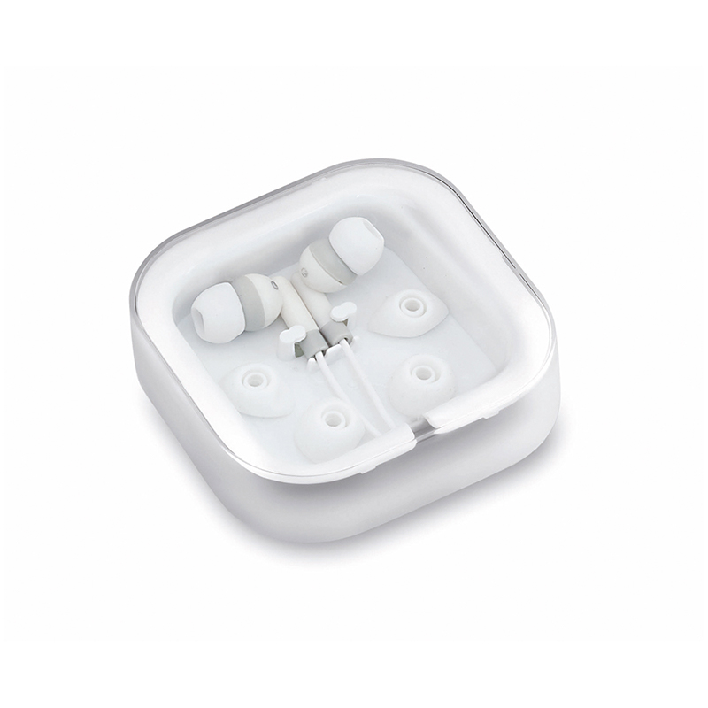 Auriculares con conexión jack de 3,5mm servidos en un estuche diseñado para imprimir tu logo a todo color. Incluye almohadillas de repuesto. Auriculares disponibles en varios colores.