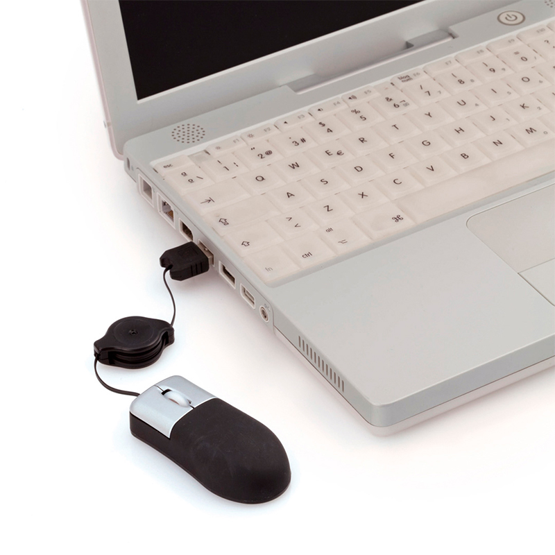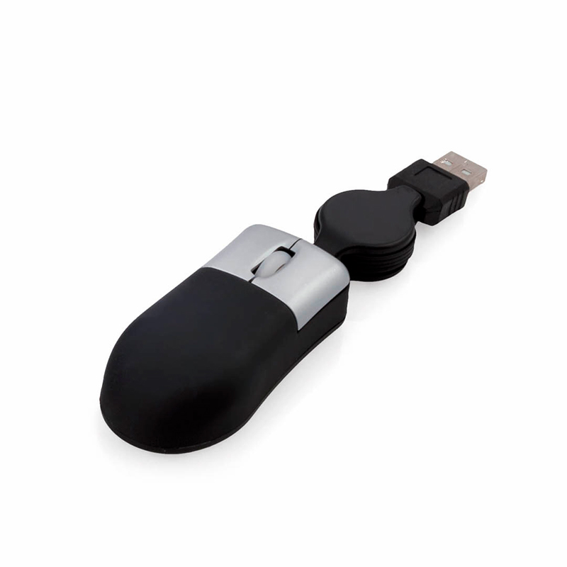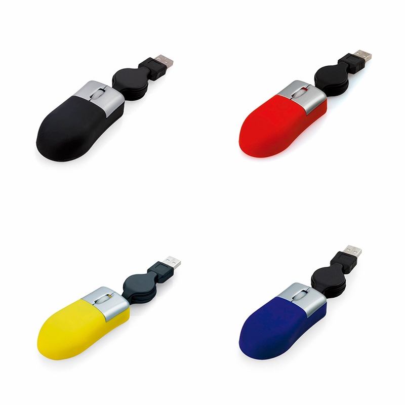 Mini-ratón óptico con cable retráctil para ordenador. Imprimimos tu logo a todo color, sin pedido mínimo. Disponible en 4 colores distintos.